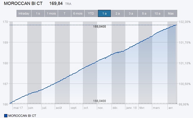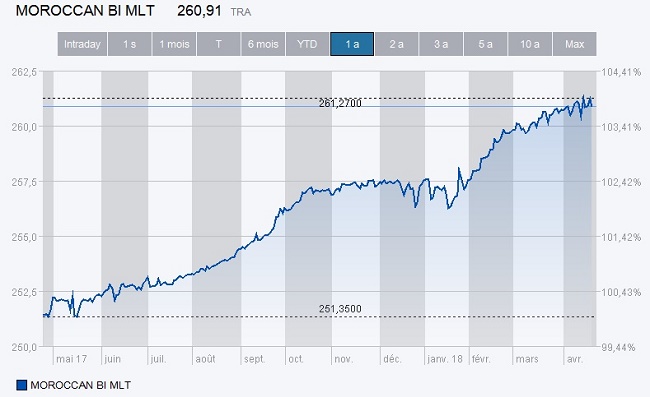 Voici l'évolution du Moroccan Bond Index OCT depuis avril 2017: