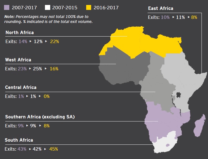 Sur ladite période, la région enregistre un taux de sorties de capital-investissement de 22% du volume global de sorties, soit le taux le plus élevé du continent hors Afrique du Sud.