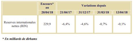 S’agissant de l’encours des réserves internationales nettes (RIN), celui-ci s’est stabilisé autour de 229,9 milliards de DH au 20 avril 2018. Il n’a donc pas varié d’une semaine à l’autre. En glissement annuel, il a reculé de 6,4%.