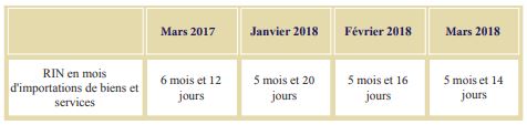 Les RIN en mois d’importations de biens et de services se situent à 5 mois et 14 jours à fin mars 2018, contre 6 mois et 12 jours pendant la même période de l’année précédente.