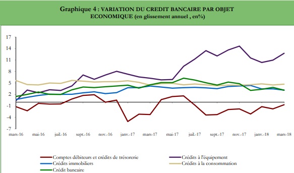 Sur la même période, les concours au secteur privé ont, en revanche, vu leur taux de progression revenir de 3,3% à 2,7%, situant leur encours à 652,4 MMDH, avec une décélération du taux de croissance des prêts alloués aux sociétés non financières privées (1,4% à fin mars 2018 contre 2,4% une année auparavant). Le rythme de progression des crédits aux ménages a suivi la même tendance, passant de 4,3% en mars 2017 à 4,1% à fin mars 2018, à 315,9 MMDH.