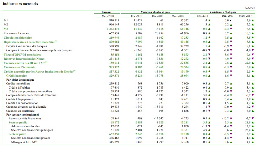 Voici le tableau des indicateurs monétaires mensuels à fin mars 2018: