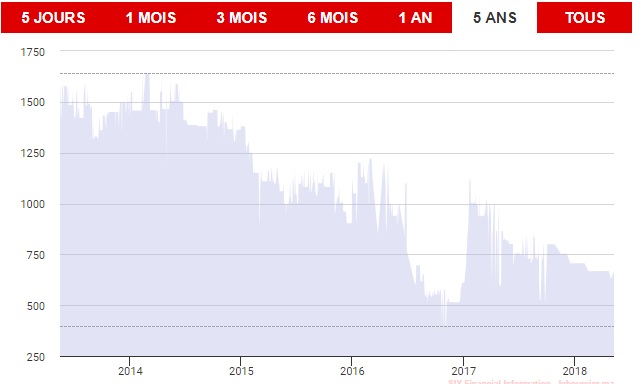 En effet, la baisse du cours de Centrale Danone ne date pas d'aujourd'hui. Le graphique ci-dessous illustre la chute du cours de Centrale Danone durant les 5 dernières années: