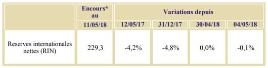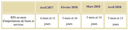 S’agissant des RIN en mois d’importations de biens et de services, elles se situent à 5 mois et 13 jours à fin avril 2018, contre 6 mois et 11 jours pendant la même période de l’année précédente.
