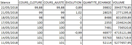 Au cours de ses neuf premières séances sur le marché secondaire, la valeur a atteint un maximum de 101 Dhs (soit +1% par rapport à son cours d’introduction) le jour de sa première cotation ainsi que la séance suivante, pour ensuite revenir à son cours d’introduction avant de baisser à 98 Dhs. La valeur est repartie depuis légèrement à la hausse.
