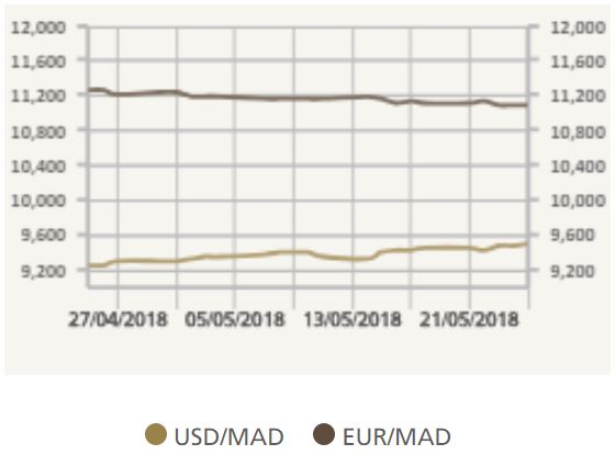 Face à l’euro, le dirham a gagné 1,6% en un mois, en passant de 11,266 (observé le 25 avril) à 11,086 dirhams pour un euro au 25 mai 2018.