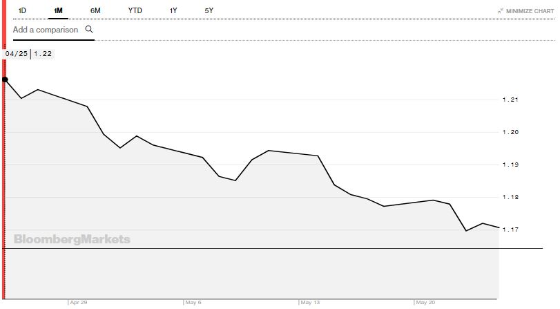 La parité EUR/USD a baissé de 4% en un mois, passant de 1,22 dollars pour un euro au 25 avril 2018, à 1,17 dollars pour un euro au 25 mai. (Voir graphique ci-dessous)