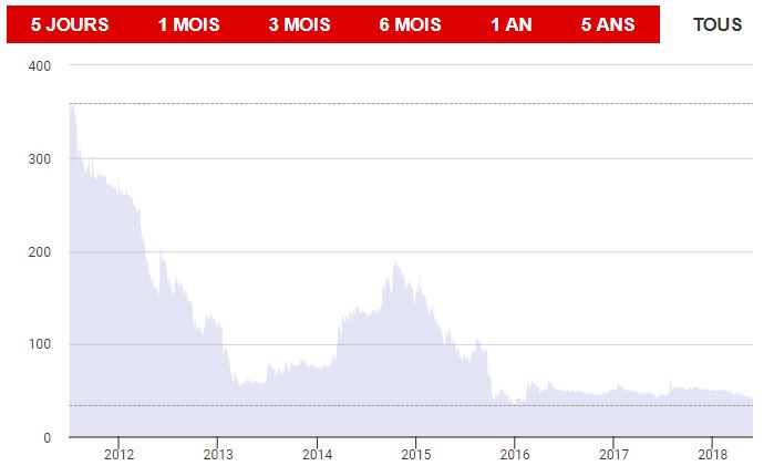 Introduite en juin 2011 au prix de 357,00 DH, son cours a dégringolé de plus de 90% pour s’établir à 34,85 DH (au 31 mai 2018).