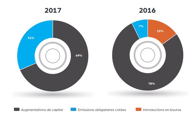 Ainsi, la répartition des capitaux levés sur le marché boursier (en comparaison avec 2016) par type de transaction se présentent comme suit :