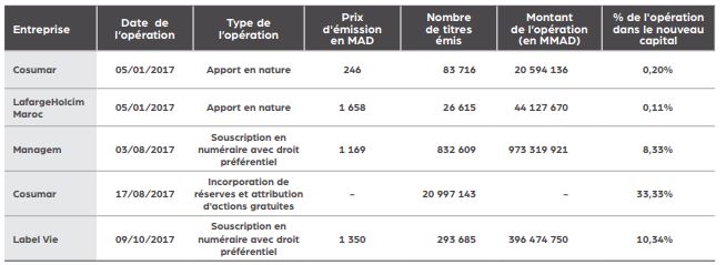 Au cours de l’année écoulé, la bourse de Casablanca a connu cinq opérations d’augmentation de capital (Cosumar, Lafargeholcim Maroc, Managem, Label Vie). Notons que Cosumar a augmenté son capital à deux reprises en 2017. (Voir tableau ci-dessous)