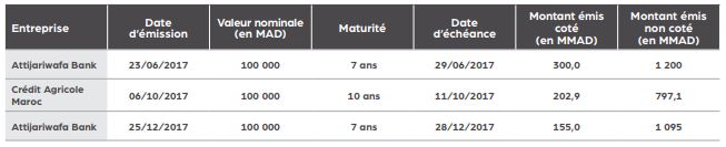 Par ailleurs, deux entreprises ont opté pour une émission d'obligations cotées, à savoir Attijariwafa bank – qui a procédé à deux opérations d’émission d’emprunts-, et Crédit Agricole Maroc. (Voir tableau ci-dessous)