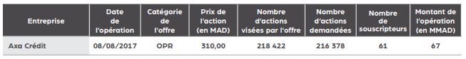 En face, Axa Crédit a procédé à une Offre Publique de Retrait (OPR), portant sur un montant de 67 MDH.