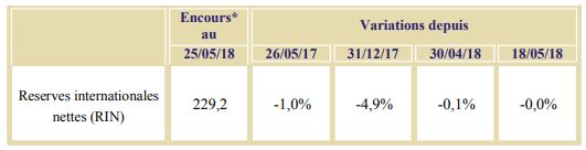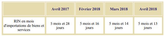 Pour leur part, les RIN en mois d’importations de biens et services se sont établies à 5 mois et 13 jours à fin avril 2018, contre 5 mois et 28 jours pendant la même période de l’année précédente.