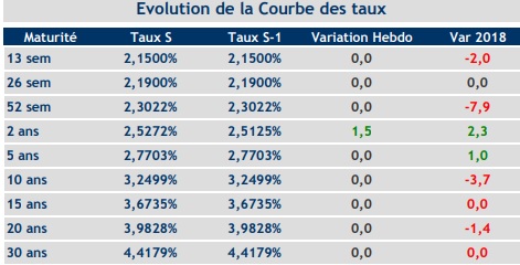 Il convient de souligner que les taux des bons à 26 semaines, 15 ans et 30 ans ont stagné par rapport au début de l’année en se situant à 2,19%, 3,67% et 4,4% respectivement.