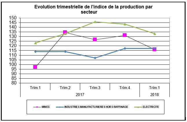 Le graphique ci-dessous illustre l'évolution trimestrielle de l'indice de la production par secteur au cours de la période T1-2017/ T1-2018: