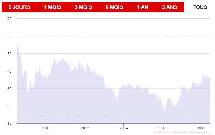 Au 14 juin 2018, le cours (ajusté) avait donc perdu plus de 23% en l’espace de dix ans, en se situant à 36,37 DH. (Voir graphique ci-dessous)