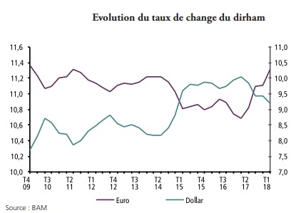 Au cours du premier trimestre 2018, le dirham s’est déprécié de 1,8% vis-à-vis de l’euro et s’est apprécié de 2,5% contre le dollar américain, selon le rapport de la politique monétaire publié par BAM.
