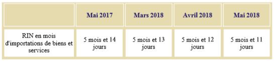 Les RIN en mois d’importations de biens et services se sont établies à 5 mois et 11 jours à fin mai 2018, contre 5 mois et 14 jours pendant la même période de l’année précédente.