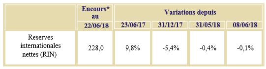 Pour sa part, l’encours des réserves internationales nettes s’est quasiment stabilisé, d’une semaine à l’autre, pour se situer à 228 milliards de DH au 22 juin 2018.