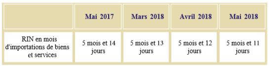 S’agissant des RIN en mois d’importations de biens et services, elles se sont établies à 5 mois et 11 jours à fin mai 2018, contre 5 mois et 14 jours pendant la même période de l’année précédente.