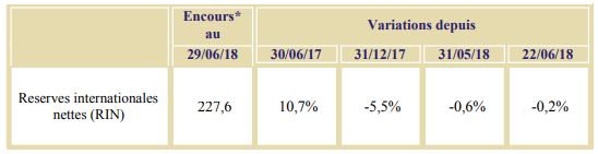 S’agissant de l’encours des réserves internationales nettes (RIN), celui-ci a baissé de 0,2%, d’une semaine à l’autre, pour s’établir à 227,6 MMDH au 29 juin 2018.