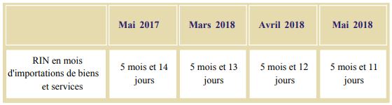 Pour ce qui est des RIN en mois d’importations de biens et services, elles se sont établies à 5 mois et 11 jours à fin mai 2018, contre 5 mois et 14 jours pendant la même période de l’année précédente.
