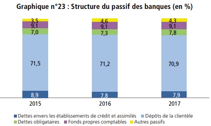 Ainsi, la structure des ressources, tout en restant globalement stable, a été marquée par une montée de la dette obligataire. A fin décembre 2017, cette dette a vu sa part dans les ressources augmenter de 0,5 point à 7,8%, au détriment des dépôts collectés auprès de la clientèle, dont la quote-part a perdu 0,3 point à 70,9%.