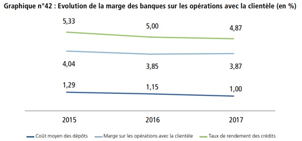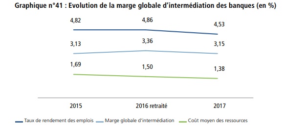 L’activité des banques en 2017 fait ressortir une marge globale d’intermédiation de 3,15%, en baisse de 21 points de base. Cela intervient suite à la baisse du taux de rendement des emplois de 33 points de base, à 4,53% ; alors que le coût moyen des ressources n'a reculé que de 12 points de base, à 1,38%. C’est ce qui ressort du dernier rapport sur la supervision bancaire de BAM.