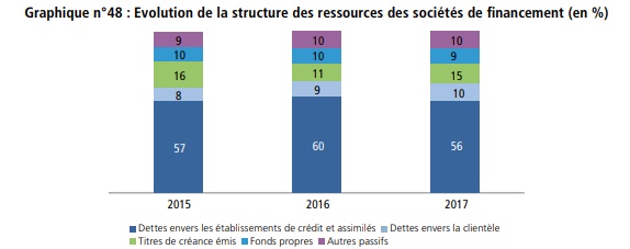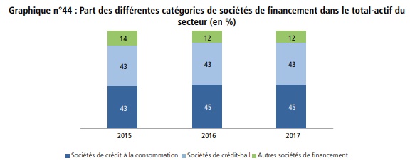 Il convient de souligner que les sociétés de crédit à la consommation et les sociétés de crédit-bail ont vu leur part dans le total-actif du secteur maintenue respectivement à 45% et 43%.