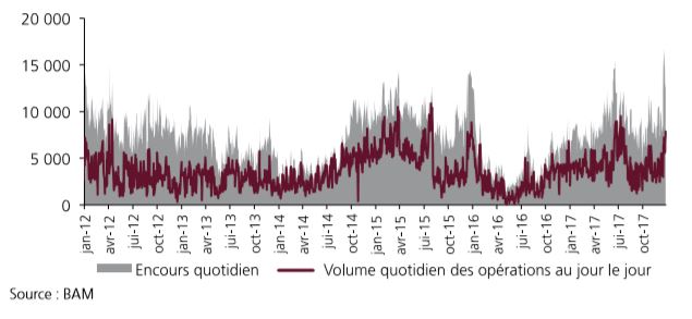La hausse des volumes échangés a concerné aussi bien les opérations traitées au jour le jour que celles à terme, atteignant en moyenne quotidienne 4,3 MMDH chacune en 2017 contre respectivement 2 MMDH un an auparavant.