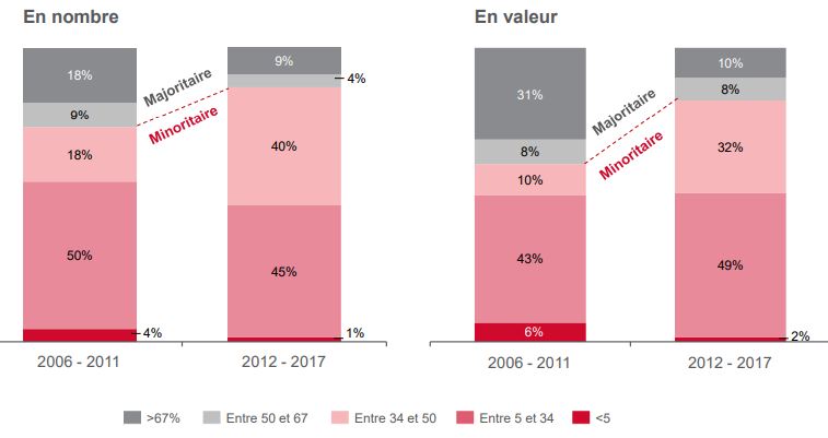 Près de 87% en nombre et 83% en valeur des transactions sont minoritaires à partir de 2012. La majorité des parts acquises à fin 2017 concernent des transactions oscillant entre 5% et 34% de parts du capital.