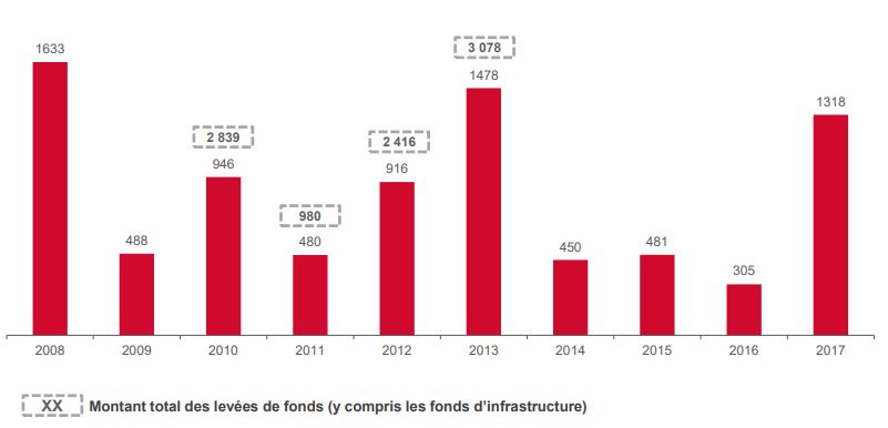 La troisième génération de fonds a été lancée en 2012 et a été clôturé en 2017. Le cumul des montants levés à fin 2017 s’élève à près de 18 MMDH dont 12,44 MMDH pour le capital investissement et 5,5 MMDH pour les fonds d’infrastructure. Les fonds transrégionaux représentent 75% des levées sur la période 2012-2017.