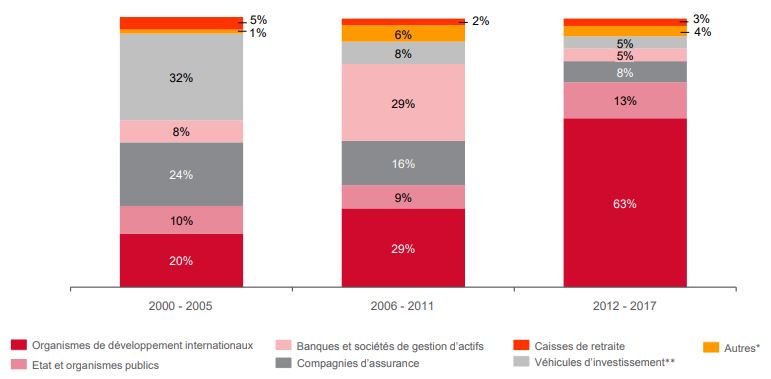 La part des organismes de développement internationaux (SFI, BERD, BEI et autres) a remarquablement augmenté avec la 3ème génération de fonds (2012-2017).