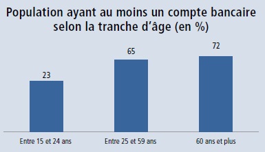 En effet, selon les mêmes données de la centrale des comptes bancaires, 77% des hommes adultes possèdent un compte auprès d'une banque, contre 37% des femmes. Par ailleurs, les personnes âgées entre 15 et 24 ans détiennent à hauteur de 23% un compte bancaire.