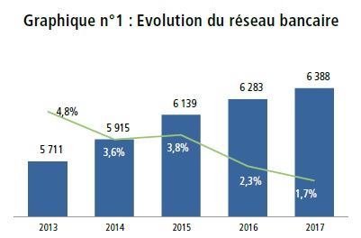 Le réseau bancaire s’est ainsi établi à 6.388 agences à fin 2017, soit 105 agences additionnelles au lieu de 144 un an auparavant. Ce chiffre inclut la création récente des banques participatives, avec 44 nouvelles agences à fin 2017.