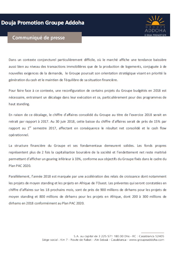 "Les préventes qui seront constatées en chiffre d’affaires sur les 18 prochains mois, sont de près de 900 millions de dirhams pour les projets de moyen standing et 800 millions de dirhams pour les projets en Afrique, dont 200 à 300 millions de dirhams en 2018 conformément au Plan PAC 2020".