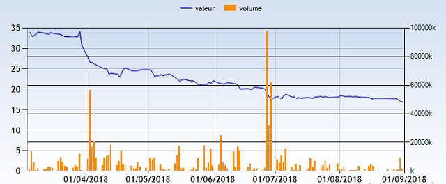 Vendredi 31 août, l'action clôturait à 16,96 DH. Elle a entamé un trend baissier depuis le 13 août, après presque deux mois de quasi-stagnation, qui ont suivi la dégringolade du cours entamée fin mars 2018 suite à la publication des résultats annuels 2017 de la société immobilière.
