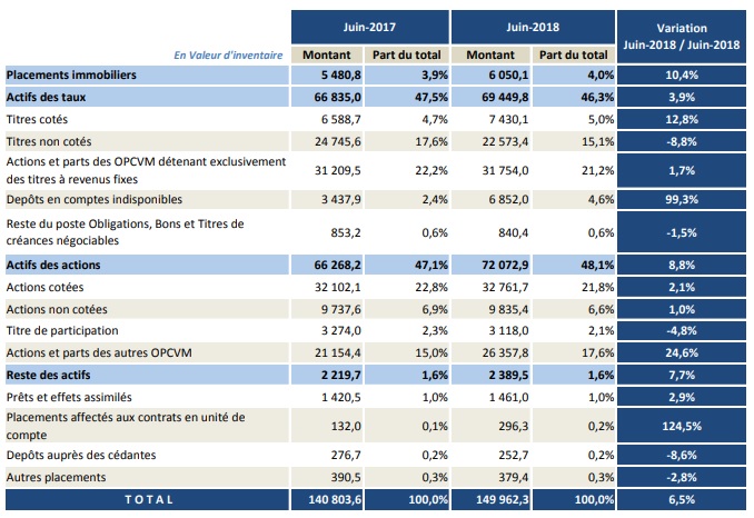 Voici l'évolution des encours des placements affectés du secteur des assurances par nature d'actif à fin juin 2018:
