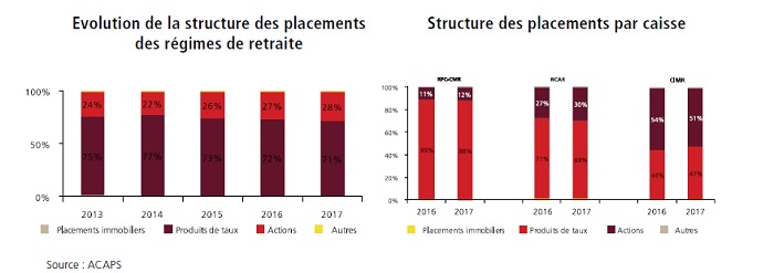 En effet, en dehors des dépôts de la branche long terme de la sécurité sociale de la CNSS, effectués essentiellement auprès de la CDG, l’étude de la structure des placements des trois autres régimes (CIMR, CMR, et RCAR) montre que les placements obligataires ont représenté en 2017 une part de 70,8% (dont 50,7% en BDT) du total des placements contre 28% pour les actions.
