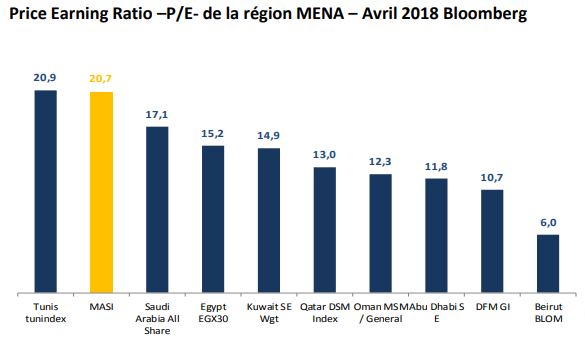 La Bourse de Casablanca est la deuxième place la plus chère de la région. En effet, la cote casablancaise se place en deuxième position des P/E (Price earning ratio) de la région MENA, juste derrière la place tunisienne qui affiche un P/E de 20,9 (à fin 2017).