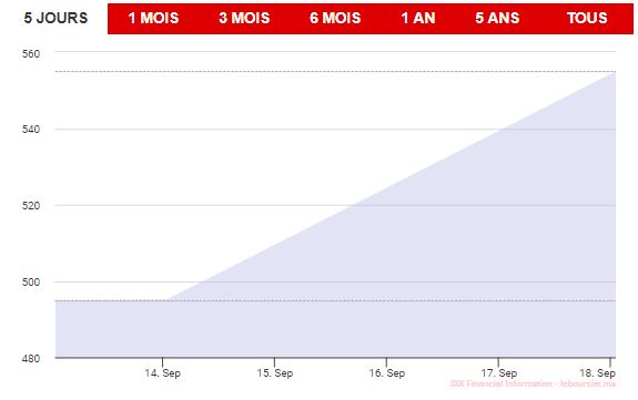 Suite à la publication des résultats du premier semestre 2018 de Sonasid (le lundi 17 septembre), son titre en bourse a bondi de 12% pour se situer à 555,00 DH à la mi-séance boursière de ce mardi 18 septembre. (Voir graphique ci-dessous)