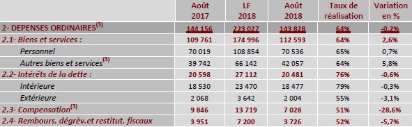 A ces dépenses ordinaires s'ajoutent des dépenses d’investissement émises, en hausse de 1,8%, à 38,1 MMDH à fin août 2018, en raison de l’augmentation de 2% des dépenses des ministères et de 1,4% des charges communes.