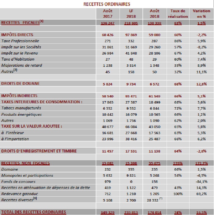 Sur la base des recettes encaissées et des dépenses émises, l'exécution de la loi de Finances à fin août 2018, telle que révélée par les chiffres de la Trésorerie Générale du Royaume, fait ressortir un déficit du Trésor de 23,7 MMDH, en légère baisse par rapport à celui affiché à fin août 2017 (25 MMDH).