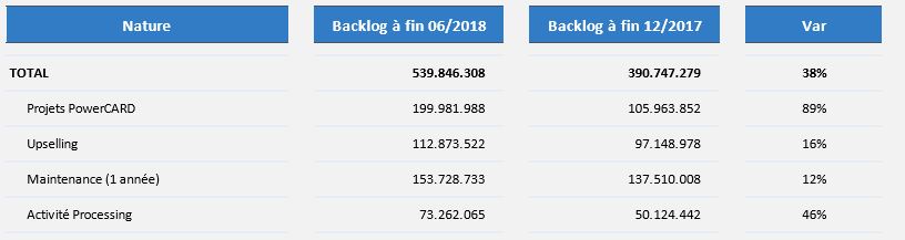 L’activité Processing (propose des solutions en mode outsourcing) continue de contribuer au renforcement du Backlog avec la vente du 1er projet processing qui vient s’ajouter à l’activité existante de Switching.