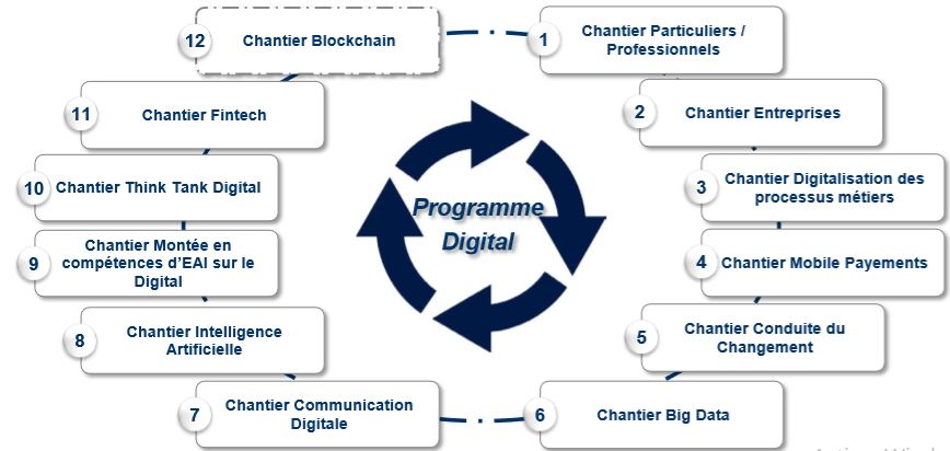 BMCE Bank poursuit sa mue digitale à travers le déploiement d’un programme décliné en douze chantiers. (Voir schéma ci-dessous)