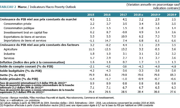 Pour 2020, la Banque mondiale s'attend à une croissance de 3,5% au Maroc, accompagnée d'un déficit budgétaire de -3% du PIB et d'un solde du compte courant de -4% du PIB.