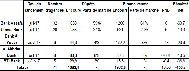En se basant sur les comptes publiés par les cinq banques participatives indépendantes (les fenêtres participatives n’ayant pas encore fait connaître leur situation à présent), le comparatif entre lesdites banques fait ressortir le tableau suivant :