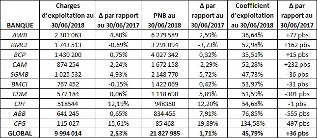 D’une autre part, le coefficient d’exploitation global de l’industrie bancaire marocaine a augmenté de 36 points de base à fin juin 2018, atteignant ainsi 45,79%.