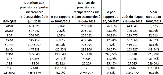A fin juin 2018, le coût du risque global du secteur bancaire marocain, à savoir les dix principales banques commerciales, a augmenté de 15,71% par rapport à fin juin 2017. Il a atteint les 2,3 MMDH.