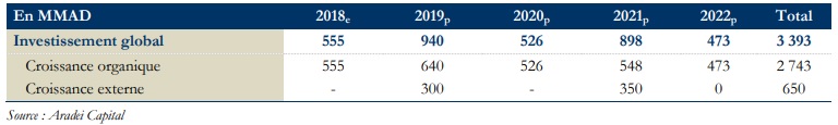 Dans le cadre de sa stratégie de développement, Aradei Capital dit envisager de poursuivre l’expansion de sa surface commerciale et de son parc immobilier sur la période allant de 2018 à 2022. Pour cela, la société prévoit d’allouer une enveloppe d’investissement de près de 3,4 MMDH (voir les détails dans le tableau ci-dessous).